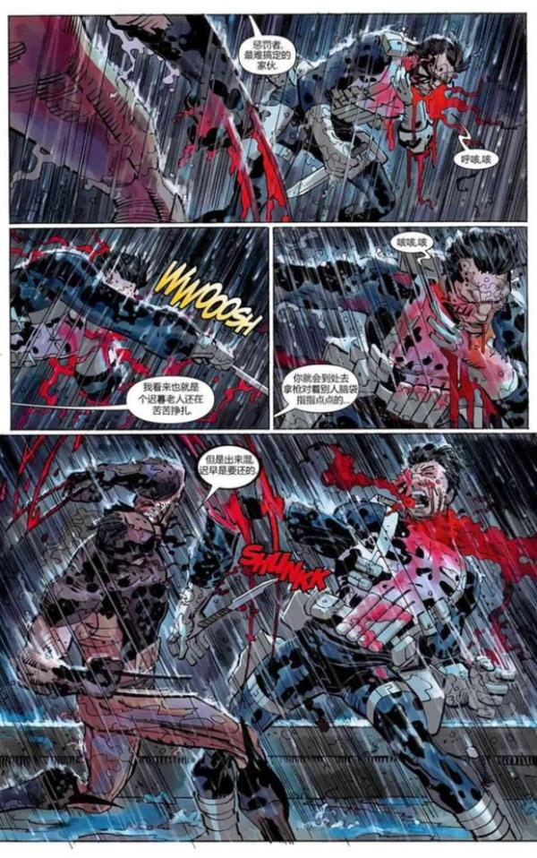 漫威漫画也有类似的惨烈时刻,在《黑暗王朝》中,金刚狼的儿子戴肯——暗黑金刚狼与惩罚者鏖战,最终这位血腥做派的反英雄被戴肯砍下胳膊,并被撕得四分五裂。