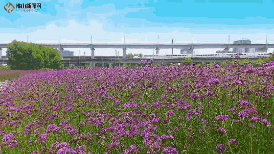 除了大片硫华菊,这里还种植了密密麻麻的柳叶马鞭草,与高铁列车互相映衬,花期估计将持续到6月,免费开放欣赏,目前已成为最新的拍照胜地。