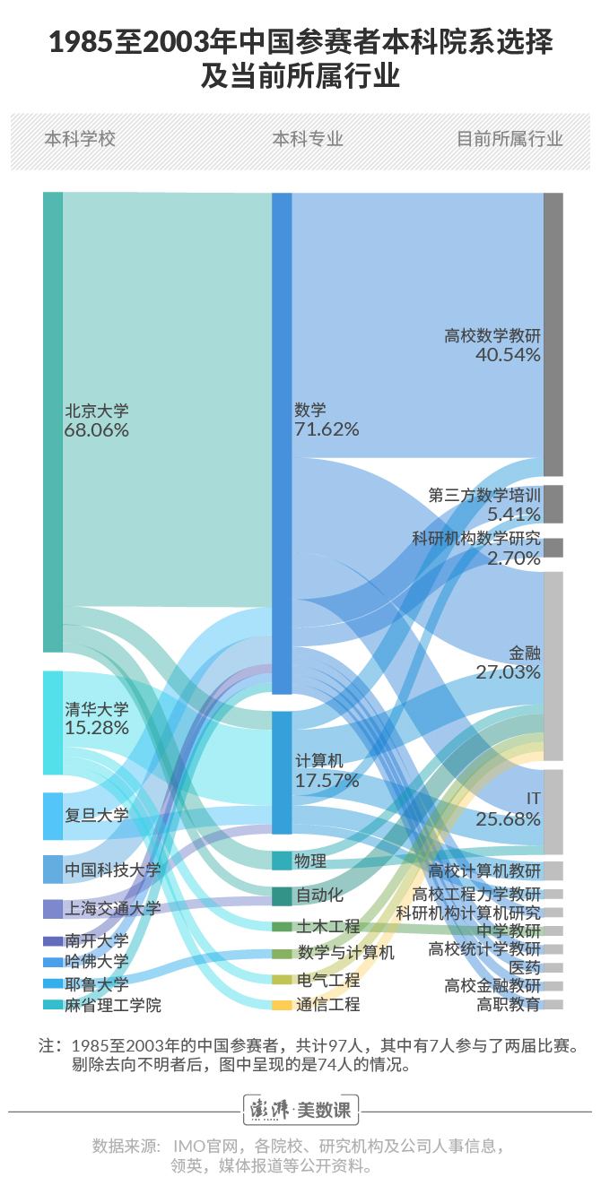1985至2003年,IMO的中国参赛者共计97人,包括付云皓在内的8人参与了两届比赛。我们一共追踪到了其中74人从本科毕业至今的人生选择:本科时选择数学专业的个体有71.62%,如今从事职业仍与数学研究或教学直接相关的人数占比缩小为48.65%;尽管本科学习金融专业的人数为零,但目前从事金融行业的人数仅次于高校数学教研。