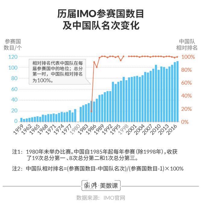 IMO的发展史很短。1959年第一届赛事在罗马尼亚举行时,参赛国只有东欧七国。随后每一年(1980年除外),这场竞赛未曾中断,影响力也在不断增长——参赛国数目的攀上是一个例证。