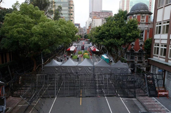 台当局架蛇笼、拒马警戒。(图片来源:台湾《联合报》)