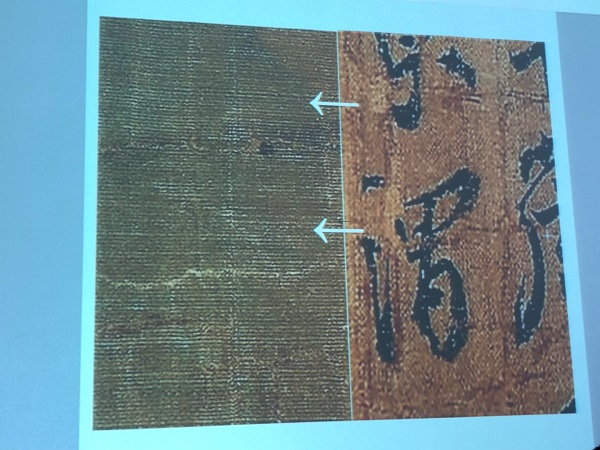 赵华:关于坤卦印,我看了一下“坤卦”右边是补绢补出来的,所以说“坤”的右边应该有一个边界,就是说是不完整的,所以推出一个“坤”字不算严谨。从三个坤卦中间断的地方绢的纹理有一种折的情况,所以可能是没有断的。