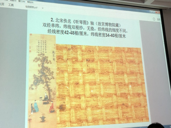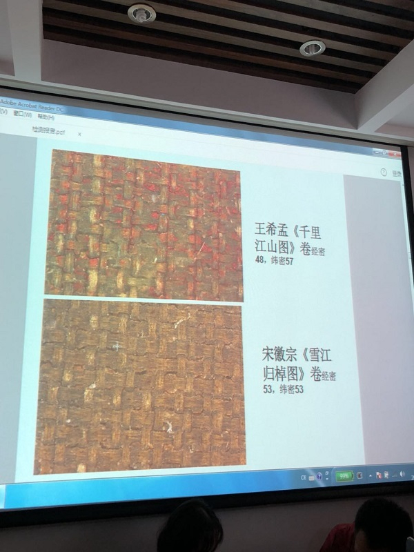 《听琴图》的绢地检测结果3。《芙蓉锦鸡》也是双丝,密度也不一样。4。《雪江归棹》有争议,有认为宋徽宗真迹,有认为代笔,最后确定还是真迹的可能性大,因为我们比较绢,宋徽宗用的这个绢是最好的,密度是50-55根/厘米经线,纬线密度也是如此。