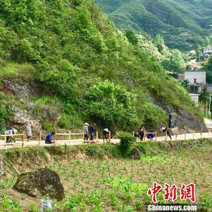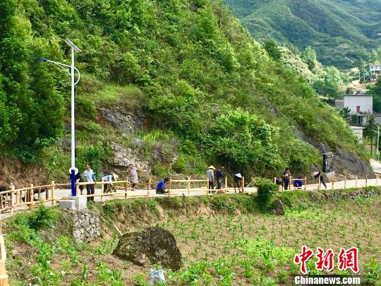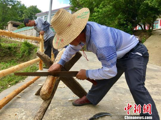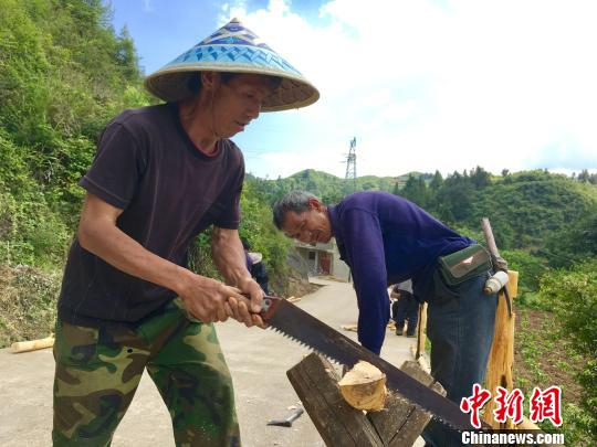 福泉市仙桥乡王卡村头寨组的苗族同胞们锯木头,垒石墙,搭护栏、植花草,为建设美丽新头寨蛮拼的。 杨云 摄