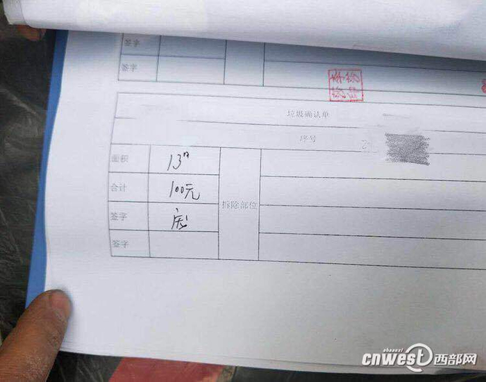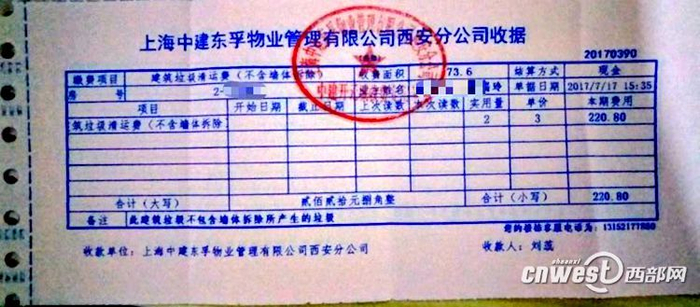 王先生提供的建筑垃圾清运费收据。西部网讯(见习记者 李卓然)“已经交了装修押金、建筑垃圾清运费,为什么物业还要收每平米80元的砸墙垃圾清运费,这样的收费合理吗?”日前,西部网民生热线栏目接到西安市民王先生的投诉,称西安三桥中建开元城小区物业乱收费,不但要收每平方米3元的装修垃圾清理费,还另外收取每平方米80元的砸墙垃圾清理费。这笔钱到底该不该收?对此,西部网记者进行了走访调查。