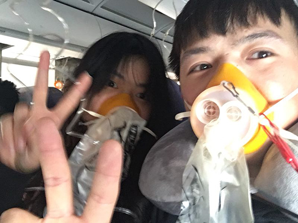 7时42分,飞机顺利备降双流机场。在跑道上滑行时,周建强打开手机,和女友拍了一张自拍照。照片上,两人戴着氧气面罩,比着剪刀手。