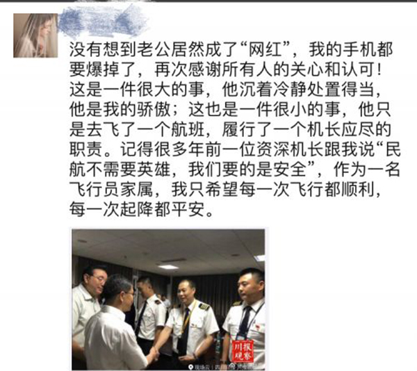 邹函的一条朋友圈这样写道:“这是一件很大的事,他沉着冷静处置得当,他是我的骄傲;这也是一件很小的事,他只是去飞了一个航班,履行了一个机长应尽的职责。记得很多年前,一位资深机长跟我说,民航不需要英雄,我们要的是安全。作为一名飞行员的家属,我只希望每一次飞行都顺利,每一次起降都平安。”