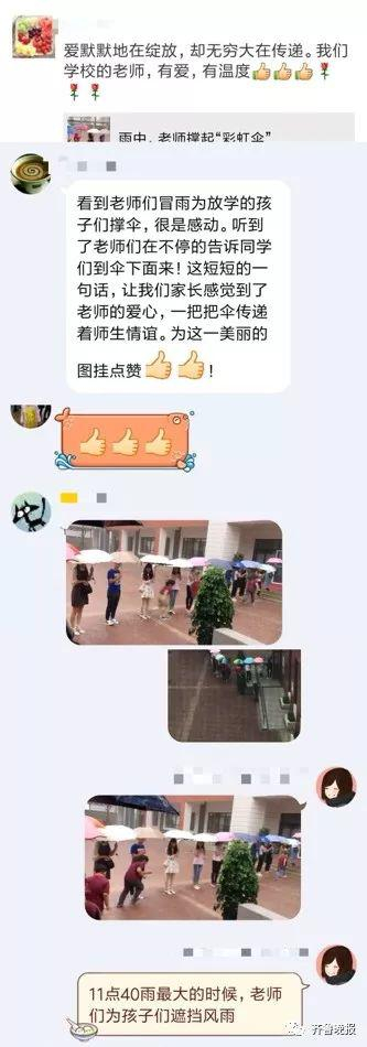 济南市槐荫区实验学校(山东师大保利实验学校)的校园里发生了这样感人的一幕:学校十几位老师在倾盆大雨中不约而同的撑起一把“彩虹伞”