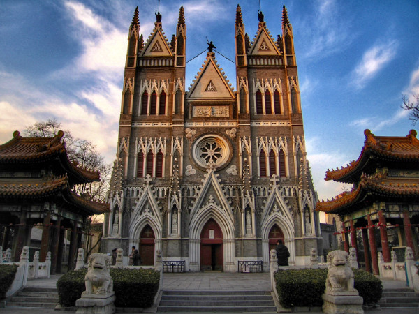 北京西什库天主教堂,1703年开堂,是北京最大最古老的教堂之一。哥特式教堂外有石狮和乾隆御碑亭,教堂内红绿色调,还有康熙对联,十分特别。1900年义和团运动爆发,拳民在北京放火烧掉教堂和一切与西洋有关的事物,西什库教堂更是其进攻的焦点,教堂里藏着3000多名外国教士和中外教徒,守卫的却只有法国和意大利驻华公使馆的40余名士兵。