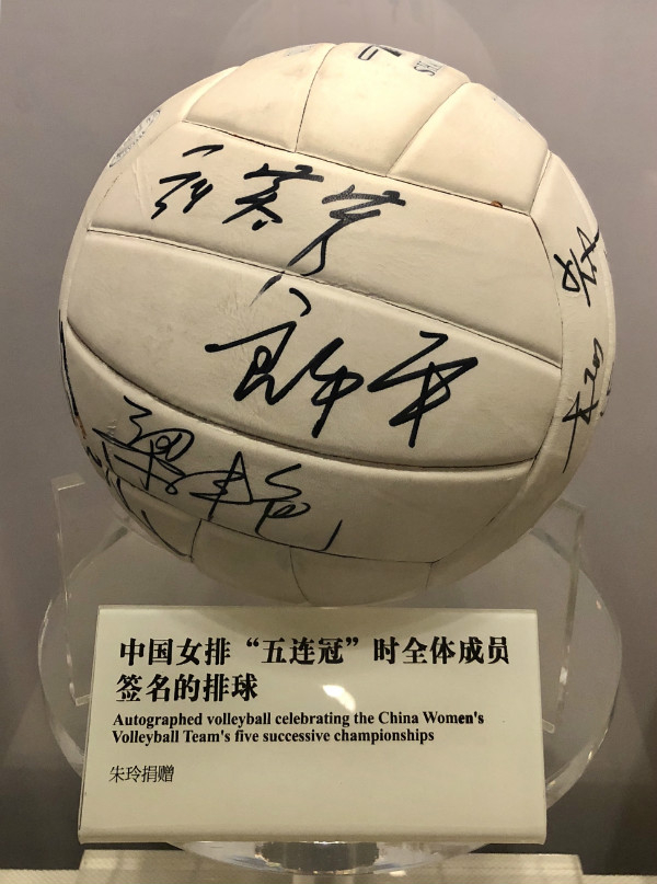 博物馆里还有80年代中国女排“五连冠”时全体成员签名的排球。2016年里约奥运会,中国女排以3比1战胜塞尔维亚队,时隔12年再夺奥运会冠军,那场比赛多么励志。