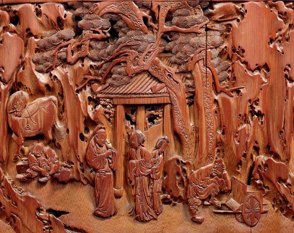 据介绍,“以刀代笔,以书法刻竹”,是嘉定竹刻的主要特点和传统技艺。据《嘉定县志》记述: “竹刻为艺术上精品,吾邑最负盛名,其为它处所不能媲美者,则为刀法。嘉定竹刻有两种型式,一是以竹筒刻人物山水、花卉走兽,就竹之围圆而成,俨然名画;若笔斗、酒杯、香筒诸器是。一是以老竹根,就其高、卑、曲、折、浅、深之宜,刻为人物、山水、果蔬,花卉之类,即目今之立体雕刻,当时称之为“阳文”。