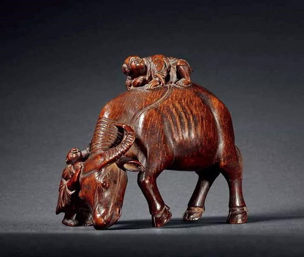 此竹根雕牧童戏牛摆件,构思巧妙。牧牛二小童,一趴卧牛背,翘首向天若睹浮云飞鸟;一欲攀牛首而上,双手握其角右足抵牛额,仰首相呼;牛则侧首略曲左前脚,小童之天真顽皮,水牛之憨态呼之欲出,使人观之如在眼前几欲忘为雕刻矣!通观全器,细微之处尽显精雕之工,一丝一毫均为神来之笔,极富意境,实乃明末清初竹根雕之精品。