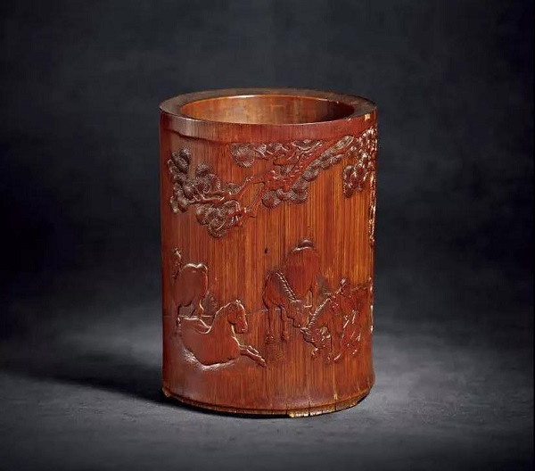 笔筒呈直筒式,下承三足。采用浅浮雕“薄地阳文”技法雕成。外壁雕三株松树,松下牵马两人眼神交会,似有传语。五匹马或卧地憩息,或低头饮水,或踌躇不前。在筒身另一侧的岩石上方刻阴文“甲寅长夏制吴之璠呈璘翁台臺”行书款。 整个笔筒布局妥帖,通过物体边缘的厚薄、起伏来表现其立体感,人物、马匹刻画细腻,形态毕肖,于鬃发之隙,见微妙起伏,这是“薄地阳文”浅浮雕工艺的佳妙之处。