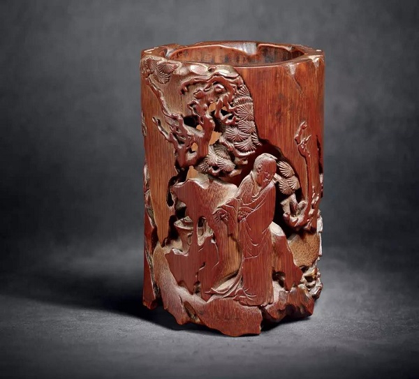 朱稚征,号三松,为小松仲子,是明代嘉定派竹刻创始人朱鹤之孙。虽然朱鹤(号松邻)为朱氏竹雕开创者,但发展到朱三松,技术更加精炼,所刻笔筒、臂搁、香筒等物在当时便是极珍贵的珍玩,嘉庆帝对朱三松的作品也是情有独钟,尝题“传神只作萧疏笔,经久由来以朴存”。陆扶照《南村随笔》中曾这样评论朱鹤,其“雕刻刀不苟下,兴致始为之,继者其子小松缨,至其孙三松稚征而技臻绝妙”,故有“小松出名而掩松邻,三松出名而小松”之说,此件笔筒堪称朱三松的代表之作。