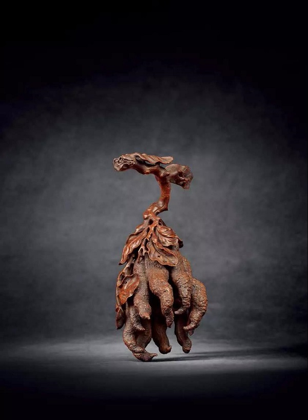 依照竹根天然形制,将光滑的细竹根与粗竹根糙涩的部位进行巧妙组合,佛手上棕点麻皮表现逼真,运用圆雕、透雕等多种技艺将果实、茎叶琢刻得惟妙惟肖,弯折掩映深浅多变,从不同角度观赏皆有不同效果,极具古典之天然意趣。佛手,属芸香科香橼的一个变种,果皮粗而厚,可入药。文人将之往茶几案头一置,香气四溢,满室清芬,更与“福寿”二字谐音,亦受到世人的追捧。此摆件与故宫博物院清宫旧藏朱小松款竹根雕佛手相似,二者在阳刻佛手筋脉,双阴线刻叶脉,枝杆局部留皮等表现技法如出一辙,为典型清早期嘉定竹根雕精品。