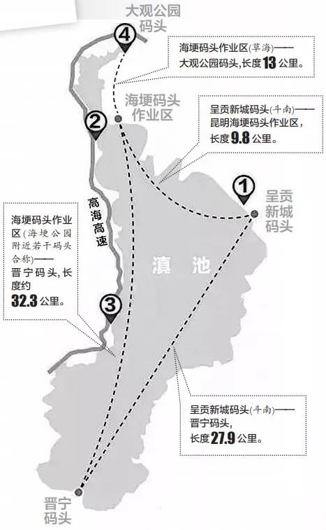 2、呈贡新城码头(斗南)—海埂码头作业区,长度9.8公里。