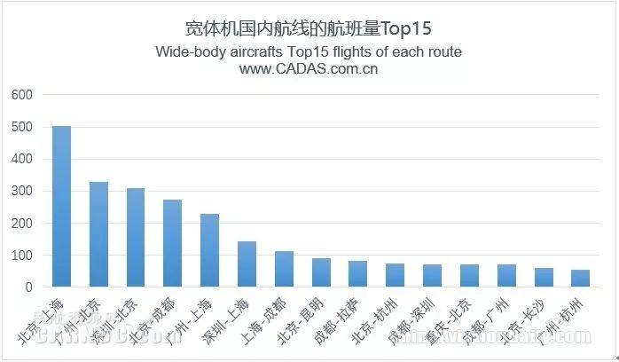 观察期内,宽体机在飞国内航线共99条,其中北京-上海航班量最高,相比位居第二位的广州-北京高出约1.5倍,往返深圳-北京、北京-成都、广州-上海等5条航线的周航班量均超过100班。在宽体机执飞的国内航线航班量TOP15中,多数为十大机场间的航线,此外还有北京-长沙以及高原航线成都-拉萨。