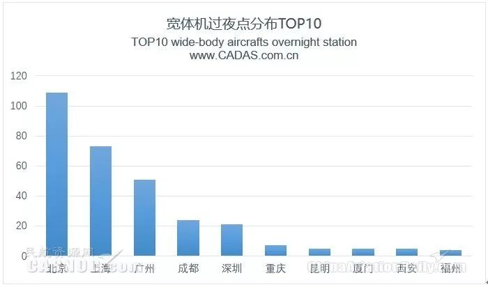 观察期内,宽体机的主要过夜点分布在北京占34%、上海占23%、广州占16%,以上机场约占73%。其次是成都和深圳,过夜运力均超过了20架。