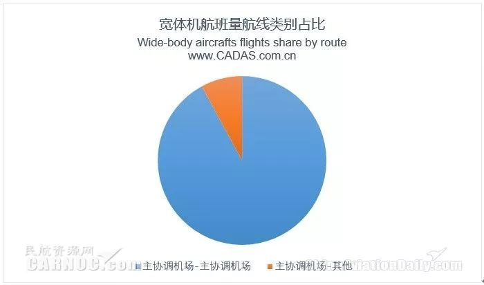 从21个主协调机场角度观察,有20个主协调机场拥有宽体机执飞国内航线,仅大连机场未拥有宽体机执飞国内航线,但有国外航空使用宽体机执飞大连的航线。主协调机场航班量占国内航线航班量96%,主协调机场间的航线航班量占国内航线航班量92.08%。宽体机执飞的国内航线主要以主协调机场航线为主,没有执飞非主协调机场间的航线。