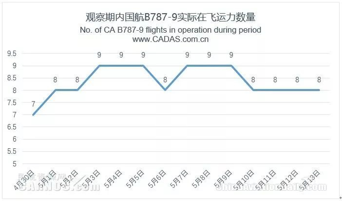 另外,笔者曾在《CADAS:国内航司波音787机型运营观察》一文中指出,近期国航B787飞机受罗尔斯·罗伊斯Trent1000C发动机影响,实际在飞运力数量减少,观察期内有5架B787飞机处于停场状态。