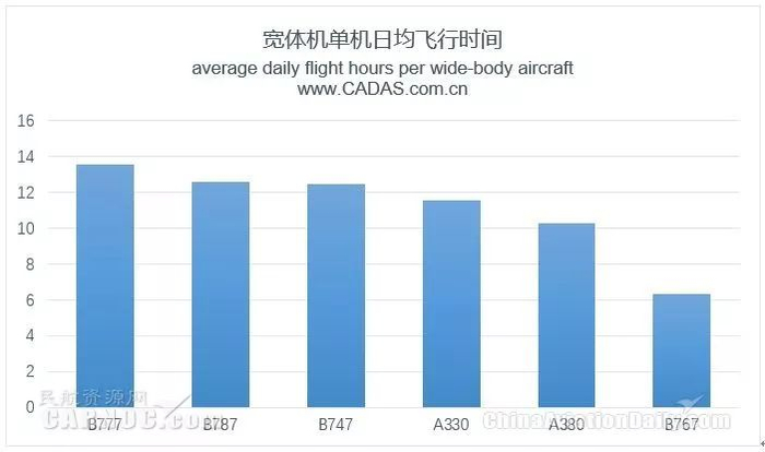 观察期内,宽体机的(在飞运力,不含停场运力)单机日均飞行时间为11.14小时。B777单机日均飞行时间最高,达13.54小时,B787为12.60小时次之。其中B767单机日均飞行时间6.34小时最低,均属于上海航空,仅执行上海=昆明和上海=广州两条航线。若从平均航段飞行时间观察,宽体机的平均航段飞行时间为5.40小时。B777平均航段飞行时间7.02小时最高,A380为6.91小时次之,B767为2.20小时最低。