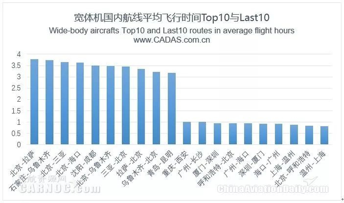 观察期内,宽体机国内航线平均航段飞行时间为2.20小时,北京-拉萨航线平均飞行时间最长,达3.78小时。其中石家庄-乌鲁木齐、北京-三亚等4条航线平均飞行时间超过3.5小时。温州-上海平均飞行时间仅为0.82小时,是期间执行的最短航段。