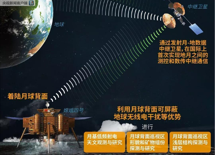 嫦娥四号月球探测器是嫦娥三号的备份星,计划将登陆月球背对地球一面的南极附近的艾特肯盆地。由于月球被地球潮汐锁定,它只能永远以同一面朝向地球。这就意味着,在月球背面登陆的嫦娥四号与地球上的测控中心不仅相隔遥远的地月距离,而且还要隔着月球球体进行通信联系。但通信信号无法穿透月球抵达其背面,这就需要中继卫星的帮助来实现数据传输,完成地面测控任务。这是“嫦娥”此次发射奔月之前先发射“鹊桥”卫星的原因。