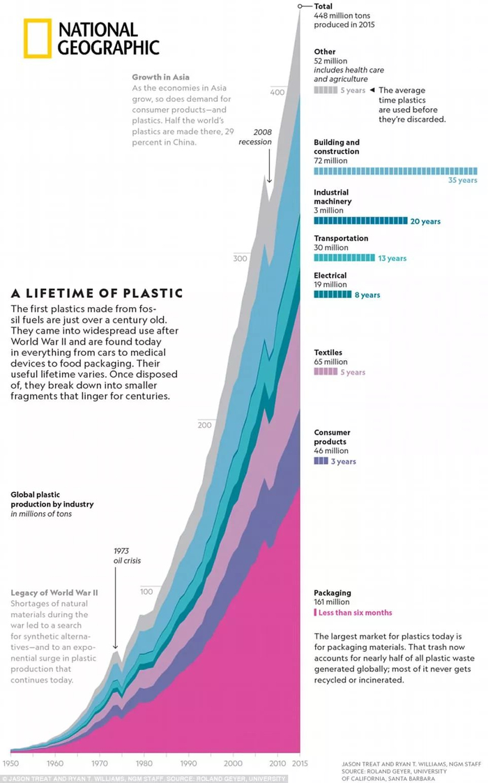 这张数据统计图显示了,全球自1950年以来塑料使用的急剧增长,这个斜度让人望而生畏。