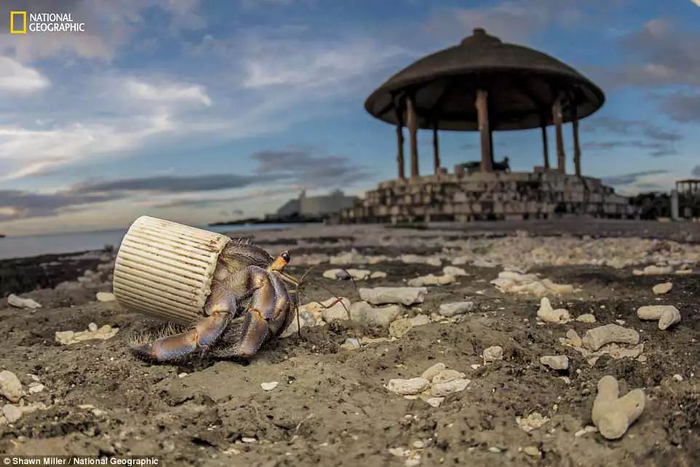 在日本冲绳岛的海边,摄影师拍到这只用塑料瓶盖保护自己柔软腹部的寄居蟹,由于海滩的游客们会把寄居蟹通常使用的贝壳捡走,而把垃圾扔在海岸,于是导致了这一现象的出现,