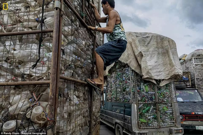 摄影师在菲律宾瓦伦苏拉的回收站拍下了这一幕,回收站的卡车上还装满了由拾荒者从街道上捡来的塑料瓶……