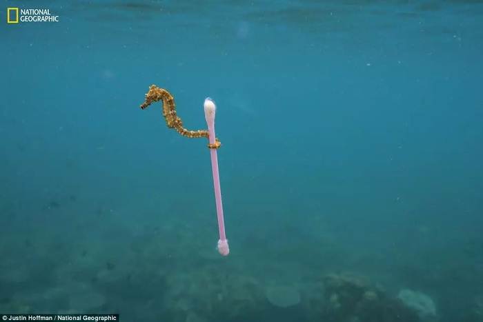 海马这种生物平时为了避免被激流冲走,会以尾巴做锚抓住海草或珊瑚,而摄影师在印度松巴哇岛的污染海域,拍到了这只在激流中把塑料棉签当作救命稻草的小海马,这张照片看到就让人心疼,海马在激流中极其容易因为快速摆动背鳍而疲劳致死,所以海洋中的垃圾愈发增多,海马错将塑料垃圾当作固定物的几率就越大,它们的数量就会因此急剧减少。