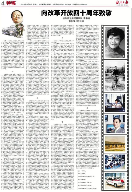 吉利因为这四十年的历史机遇,从无到有,从小到大,由弱变强,从小山村走向全中国、走向全世界。所有这一切都应归功于改革开放的好政策,我们必须倍加珍惜,为中国汽车跑遍全世界,而不是全世界的汽车跑遍全中国而顽强拼搏。