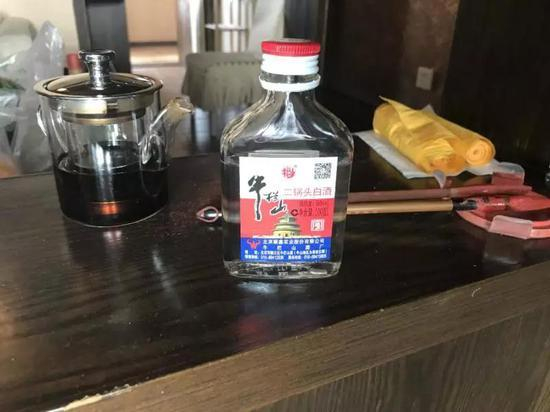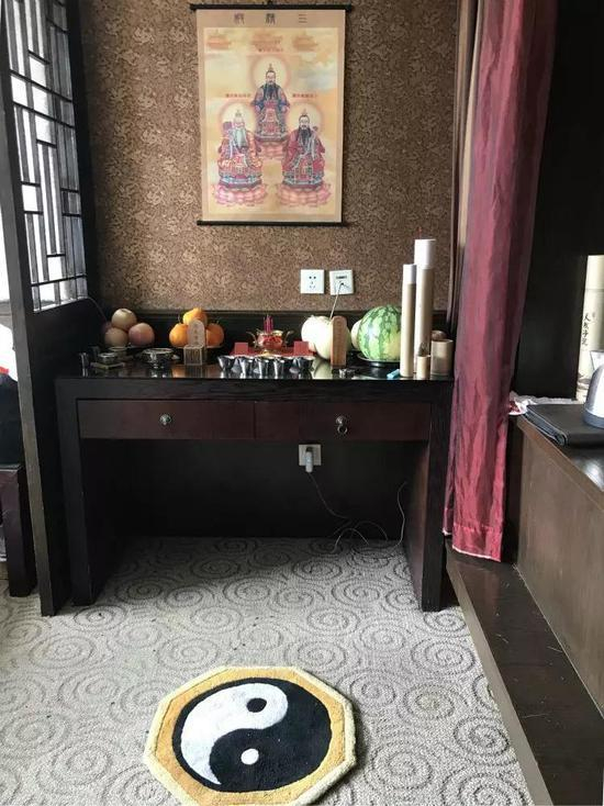 记者环顾四周,只见40平方米左右的客房被辟出一室一厅。内室床铺还未整理,一个小孩在上面又蹦又跳。床边设置香案,上方悬挂着一幅道教三位至高神——元始天尊、灵宝天尊、道德天尊的“三清”像。香案上供奉的瓜果间,还见缝插针地竖着“混元雷祖”牌位。床尾处墙上,歪挂着一口八卦钟。地上铺着八卦垫,做隔离的博古架上胡乱堆着朱砂、毛笔、黄布、100毫升装牛栏山二锅头白酒两瓶,感觉不像宾馆客房。