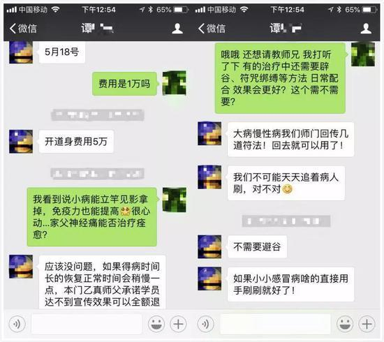 记者与“谭师兄”的对话,对方表示开道身费用5万;师门回传几道符法就可治疗大病慢性病,感冒用手刷刷就解决了。