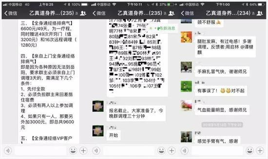 在乙真微信群里显示的各种活动:左图为远程调理报价;中图为不定期晚间远程调理报名活动;右图为调理结束后,成员的反馈。