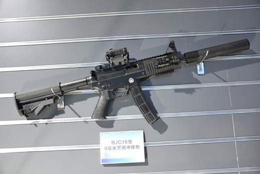 比如,JH16-1和BJC16这两种冲锋枪在弹匣座上都印有警徽,这也证明了它们应该已经成为公安部门的制式冲锋枪型号。前者从外形设计上看,很有一些德国HK公司UMP冲锋枪的影子,但是采用了人机功效更好的折叠伸缩托,而且护木设计以及机匣上方全长型的皮卡汀尼导轨都符合当今世界新型冲锋枪的发展潮流。与前者相比,BJC16几乎可以看做是美制M4卡宾枪的“迷你版”,从握把、伸缩枪托到拉机柄、准星等细节设计都充满了浓浓的“美国情调”。这种模仿国外名枪的设计风格可以在一定程度上让使用者更为接受和认可这支新型冲锋枪,不过由于护木长度较短,很有必要加装前置小握把。