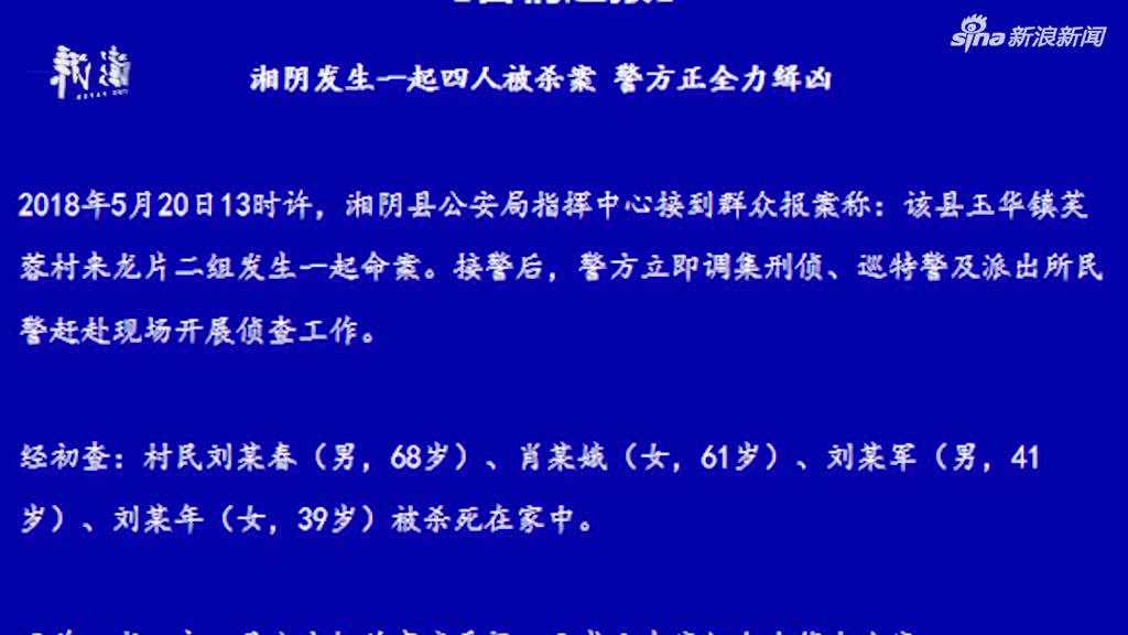 5月21日,湘阴县委宣传部微信公号“掌上湘阴”通报:5月20日13时许,湘阴县公安局指挥中心接到群众报案称:玉华镇芙蓉村来龙片二组刘某春一家四口在家中遇害。接警后,省、市、县三级公安机关快速反应,县委、县政府高度重视,成立专案组全力侦办此案。经专案组民警紧锣密鼓调查走访和研判甄别,迅速锁定并控制住犯罪嫌疑人刘某球。