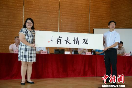缔结为姊妹校的泉州市晋光小学校长黄加贤(右)与新加坡南侨小学副校长林雪婷互赠礼品。 陈龙山 摄