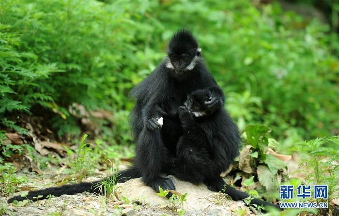 这是在麻阳河国家级自然保护区大河坝观测点拍摄的黑叶猴及幼崽(5月17日摄) 新华社发(杨文斌 摄)