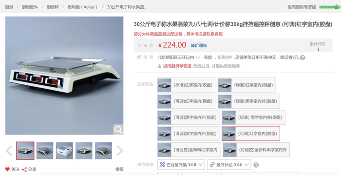 这样的现象也存在于其他网购平台。澎湃新闻以相同关键词在京东搜索,发现也有多家店铺出售此类可作弊电子计价秤。以“福淘厨具专营店”为例,该店售卖的“30公斤电子秤”在商品名中写明了“九/八/七两计价秤”、“挂挡遥控”等特点。