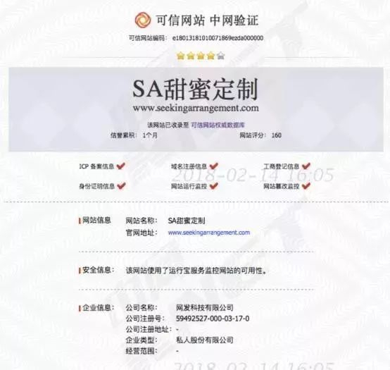 此外,天眼查信息显示,“Seeking Arrangement”于2015年10月30日在我国上海自贸区的工商部门处注册了一个名为“娱发信息科技(上海)有限公司”的企业,而且自称获得了工信部门的ICP备案。