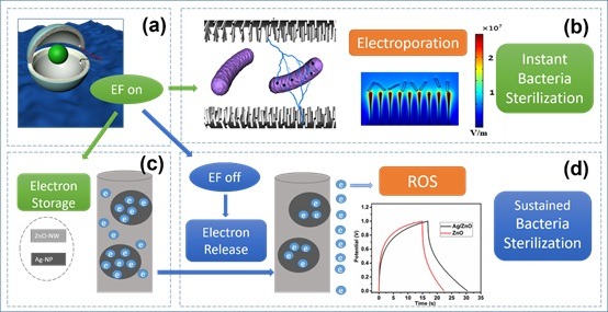 这一研究发现起源于纳米能源所李舟课题组和王中林课题组于2017年联合在Nano Energy上发表的一项研究工作,助理研究员封红青为第一作者。在那项工作中,他们将收集水波能的摩擦纳米发电机输出的电压、电流连接到修饰了氧化锌纳米线和纳米银颗粒的碳布电极上,并让细菌溶液从碳布电场之间流过。他们检测了发电机工作提供电压、电流时,流经该系统的细菌被杀灭的情况。在发电机停止工作不再对系统供电之后,他们又持续检测了一段时间内细菌被杀灭的情况。他们发现了一个奇特的现象:发电机停止供电长达20分钟的时间段内,修饰了氧化锌和纳米银的碳布电极依然对流经它们的细菌具有很强的杀灭作用!而如果没有发电机之前的供电过程,同样的修饰了氧化锌和纳米银的碳布电极则没有这样强的杀菌作用。由于该实验体系的细菌溶液只是一次性地流经电极,通电过程中可能发生的电化学产物都已随之前的溶液流走,因此断电后的抗菌性能不是由电化学产物的残留造成的,而是一种电场对材料的“残余影响”造成的。研究者发现电极材料的电容越大(氧化锌纳米银双修饰>氧化锌单修饰>原始碳布),则这种断电后的长期抗菌性能越强。同时,在断电后处理的细菌胞体内,检测到了强烈的活性氧信号。