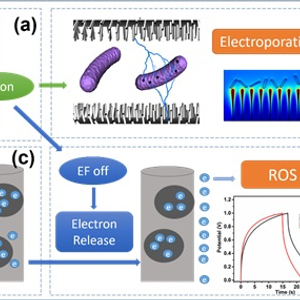 很多植入材料可通过其表面的物理修饰或化学改性,获得一定的抗菌性能,从而更适应植入的需求。这些修饰的作用机理都可落到“电”上。如在钛基材料的表面通过离子注入的方式引入银、锌等纳米颗粒,可由于在银、锌纳米颗粒的周围与钛基底发生微观的电化学反应而使得钛基底获得抗菌性能。又如通过化学修饰,在材料表面修饰上带正电荷的高分子,使得材料表面的电荷发生改变,也可使原本不具备抗菌能力的材料获得抗菌性能。再者可以引入电场直接作用在纳米材料表面,由于纳米材料的小尺寸,可以在表面形成高压电场,对细菌造成电穿孔,也可造成杀菌的效果。