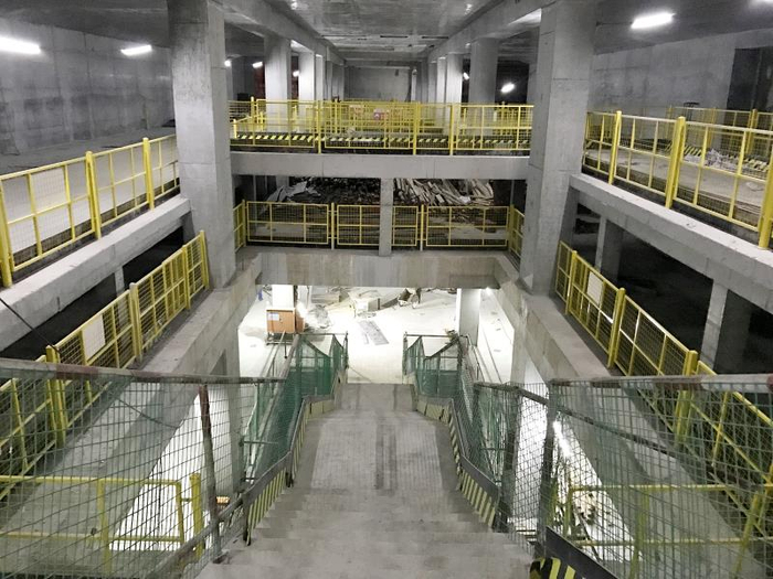 从地面往下走,到达地下22.7米的站台层后,交汇点记者看到,一些工人正在轨行区作业,新旧站点之间换乘的楼梯已经建好。顺着楼梯看去,尽头是一堵钢筋混凝土的墙壁。施工现场负责人介绍,这是80厘米厚的内衬墙,一墙之隔便是2号线的轨行区。