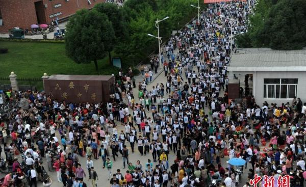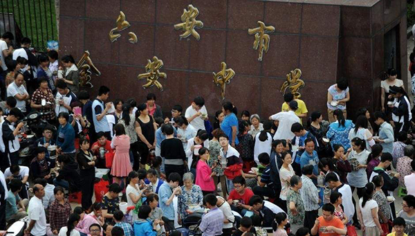 安徽省六安市金安中学的大门外,“陪读大军”带着饭菜在学校门前等待孩子吃饭。此时的学校被这些“陪读大军”围得水泄不通。