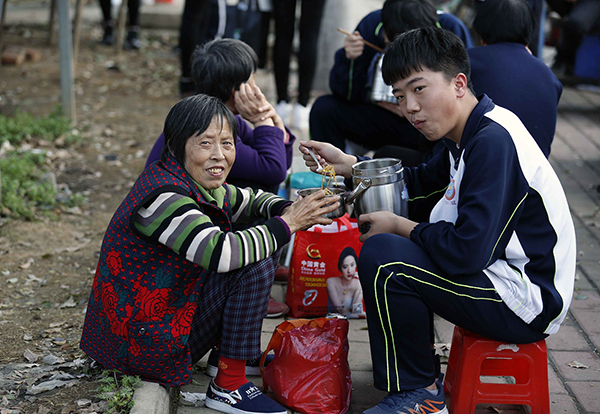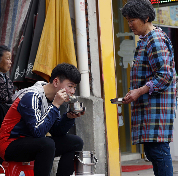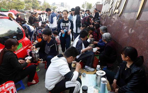 六安市毛坦厂中学门口,在校门口吃午饭的孩子。 视觉中国 图