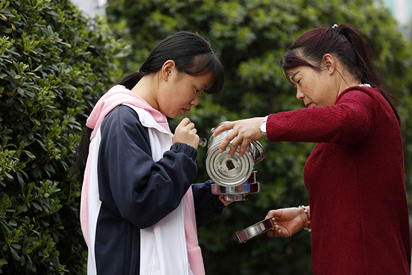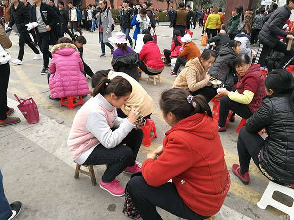 2018年4月2日,安徽六安毛坦厂中学前陪读送餐的家长。 视觉中国 图