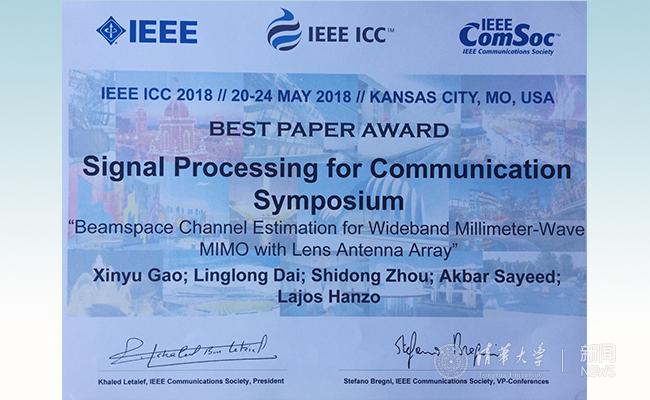 清华新闻网5月28日电 5月20至24日,由国际电气与电子工程师学会(IEEE)通信学会主办的国际电气和电子工程师协会国际通信大会(IEEE International Conference on Communications,简称IEEE ICC)在美国密苏里州堪萨斯城召开。由清华大学电子工程系2014级直博生高昕宇,戴凌龙副教授、周世东教授等人合作完成的论文《基于透镜天线的宽带毫米波多天线通信系统中的波束信道估计方法》(Beamspace Channel Estimation for Wideband Millimeter-Wave MIMO with Lens Antenna Array)荣获本届大会最佳论文奖(IEEE ICC 2018 Best Paper Award)。