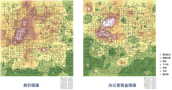 由于工作学习类第三空间主要是商业空间,在商业逻辑下会向高商业价值的区域集聚,这点在西单、金融街片区最为明显。而在房价插值洼地和办公租金洼地地区(如南城),工作学习类第三空间整体分布较少。