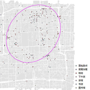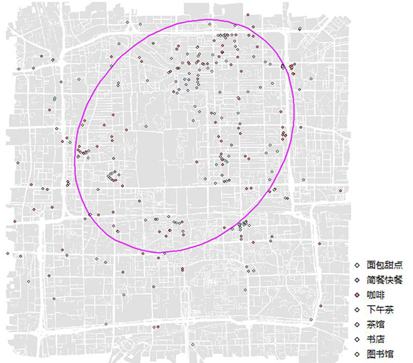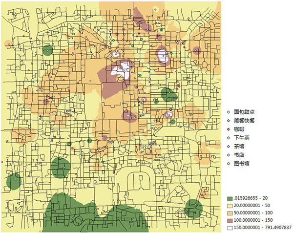 本研究首先从大众点评的评论中(获取时间为2017年12月24日),通过关键字语义识别出第三空间。根据对雍和宫、灯市口、崇文门片区的现场与网络问卷预调研,筛选出面包甜点、快餐简餐、咖啡、下午茶、图书馆、茶馆、书店——这七种工作学习类第三空间的子类。